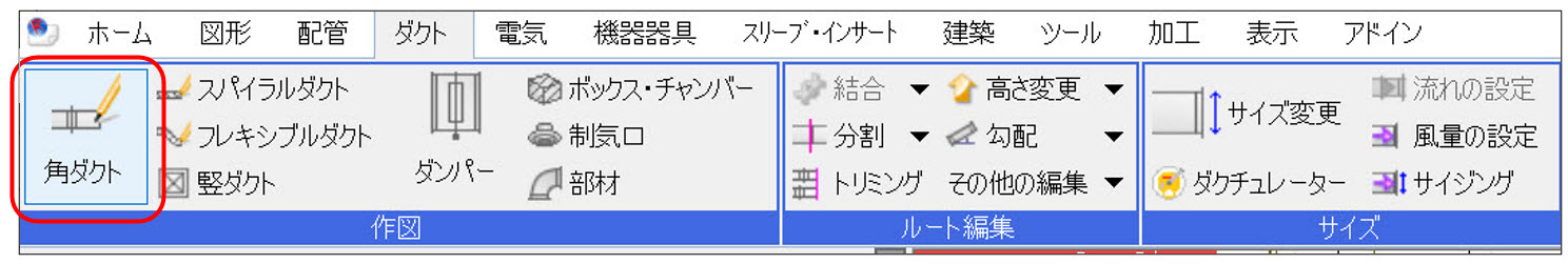 メインメニューの「ダクト」の「作図」から「角ダクト」や「スパイラルダクト」などで入力する。