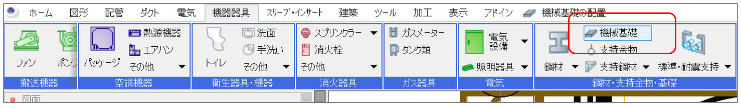 メインメニューの「機器器具」の「鋼材・支持金物・基礎」から「機器基礎」で入力する。